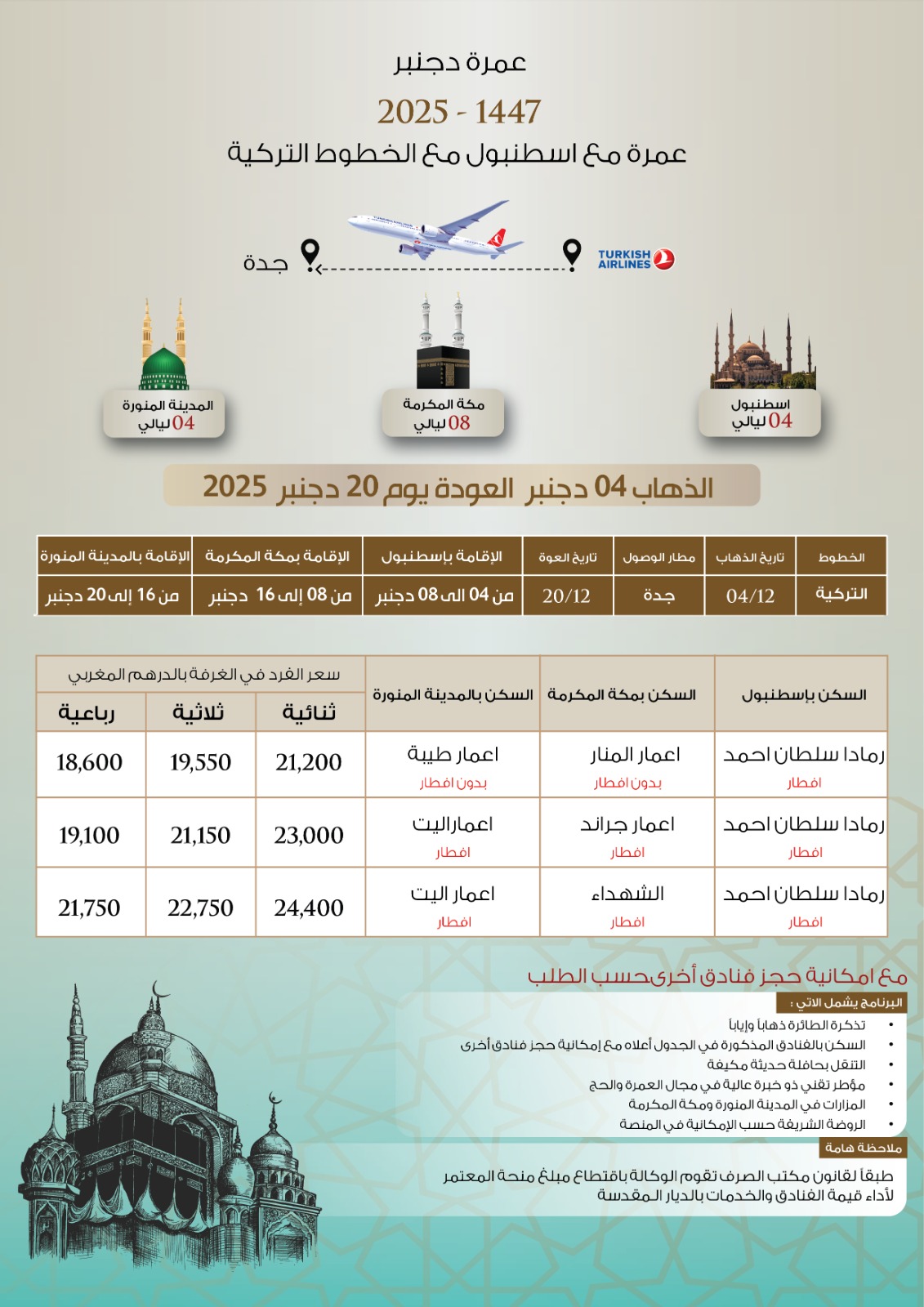 Découvrez un voyage inoubliable alliant spiritualité et culture avec notre circuit Omra et Istanbul en groupe. Parfait pour ceux qui souhaitent approfondir leur foi tout en explorant les merveilles d’Istanbul, ce programme vous offre la possibilité de réaliser la Omra dans les lieux saints de La Mecque et de Médine, suivi d’une immersion dans l’histoire et la beauté d’Istanbul.